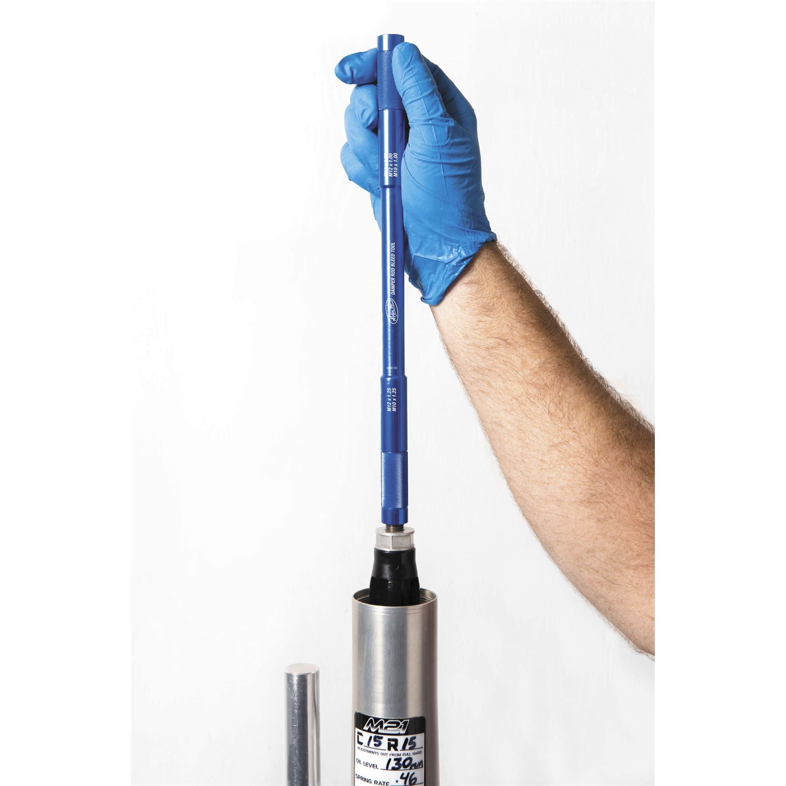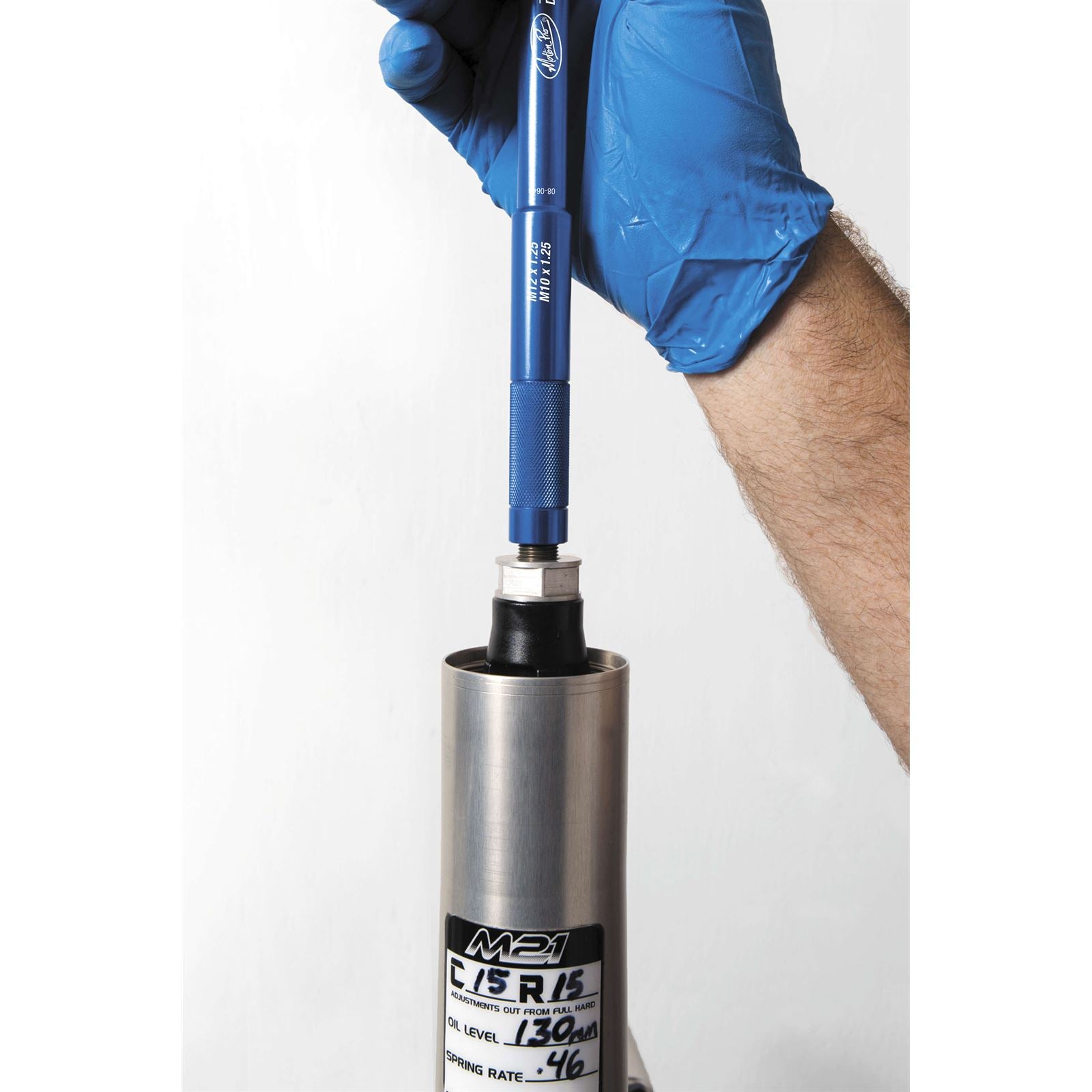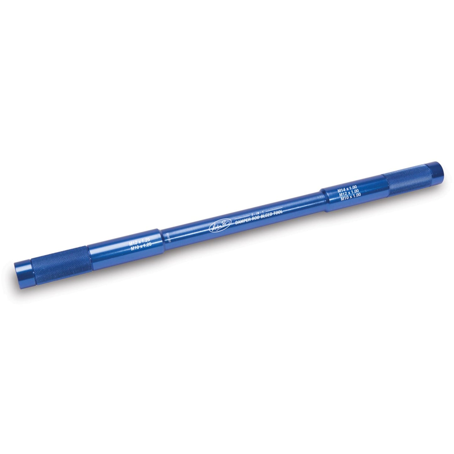Tool design allows for effortless retrieval of damping rod after spring installation. Perfect for working on Kayaba, Showa and WP inverted forks. One piece design means no lost parts. Rod includes downward facing bleed port to prevent oil splatter. Five thread sizes in one tool: M10 x 1. 0, M10 x 1. 25, M12 x 1. 0, M12 x 1. 25 and M14-1. 0 Precision billet aluminum construction with durable blue anodized finish and laser engraved markings.
