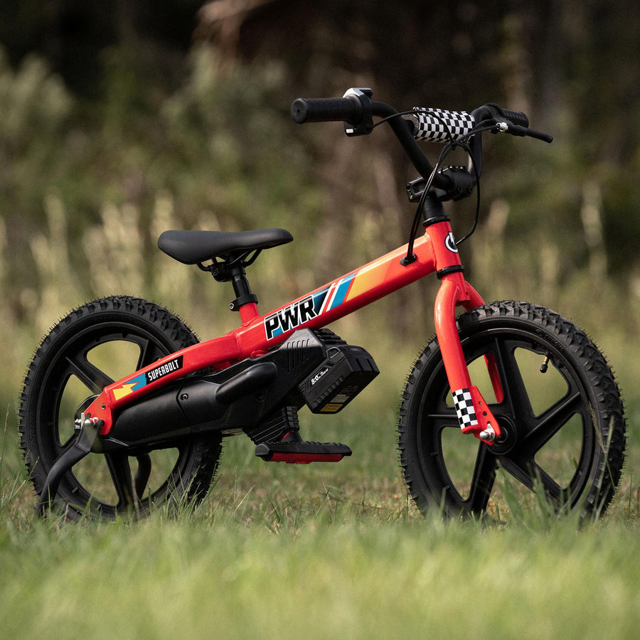 PWR has outdone themselves with the new 16" Superbolt bike for your future motocross superstar. The Superbolt 16 offers a powerful 18V brushless motor and an upgraded 20v 5.0aH battery. The three-speed setting allows for a natural progression in speed from 5mph up to 14mph, while the 16" composite wheels will tackle rough terrain like its nothing more than an ant hill.