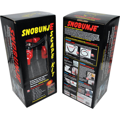 Snobunje Escape Kit puts all of the essential Snobunje pulling tools into one box - selection of 7 items that will help you and your sled escape(1) Snobunje Rattler(1) Snobunje Cobra(1) T&A Strap(1) Slicktape Retrieval Line(4) S-Hook Safety Straps(1) 15 in x 15 in Cargo Net(1) Cobra Strap